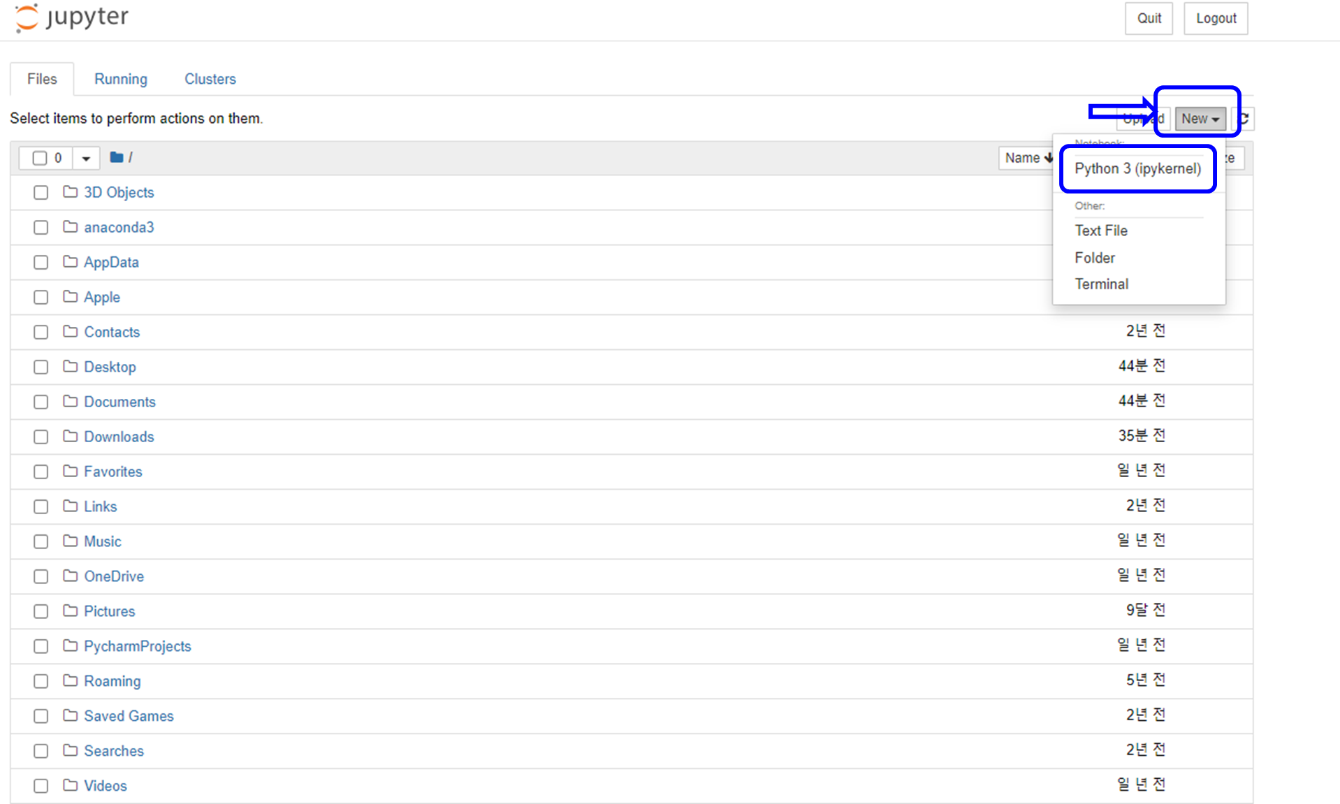 실행시키면 다음과 같은 화면이 나오는데, 여기서 "New"를 클릭하시고 "Python 3(ipykernel)"을 클릭하시면 됩니다.